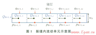 假設流體經過裂縫面進入裂縫后向水平井筒的流動為一維線性流動(圖1)。為了便于計算,將微元段處理成矩形進行汁算,裂縫寬度為wfk+1,以計算流體在裂縫中流動時產生的壓力降落。