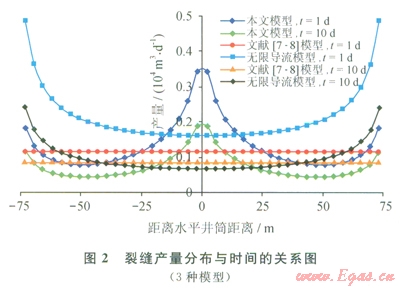 圖2是3種模型第l條裂縫的產量分布對比結果。采用無限導流模型計算結果表明,由于沒有考慮裂縫內的壓力降落,在生產初期(t=ld)裂縫內的產量分布為“U”形,裂縫兩端產量相對較高,這與本文參考文獻[15]規(guī)律一致;本文模型考慮了裂縫產量非均勻分布以及裂縫內的壓力損失,裂縫產量在水平井筒附近出現(xiàn)局部峰值,且隨裂縫內壓力損失增大,井筒附近裂縫產量的峰值越明顯,這是由于越靠近井簡裂縫生產壓差越大,裂縫產量越高造成的;由于裂縫段內相互干擾,隨著生產時間的增加,裂縫產量分布趨于均勻,但由于水平井筒壓力最低,裂縫上產量分布為近似“雙U”型,這與本文參考文獻[l4]規(guī)律相符合。