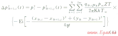 上面就完成了第一個Dt時間步長下各線匯單元及總產量計算;對于各線匯單元而言,由于產量會隨生產時間發(fā)生變化,這樣就需要利用時間疊加來求得任意時刻的值。設時間段步長為Dt,當時t=mDt(第m個時間段的結尾),則對第k+1條裂縫的第j個線匯,可得到: