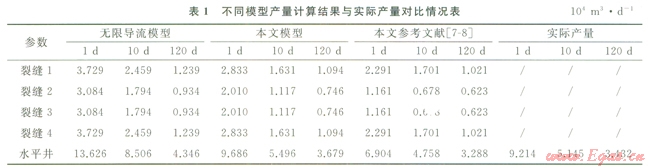 分別按照裂縫無限導流模型、本文模型以及本文參考文獻[7-8]的計算結果與實際產量對比(表1)??梢钥闯觯疚哪P偷挠嬎憬Y果從初期到穩(wěn)定生產階段最接近,表明本文模型準確性高。從3種模型計算結果的對比來看:無限導流模型計算生產ld時的產量為13.626×104m3/d、生產120d后產量為4.346×104m3/a,遠高于實際產量,表明不能忽略裂縫內壓力損失的影響。從本文參考文獻[7-8]模型的計算結果與實際產量對比可以看出,生產初期差別較大(分別為6.904×104m3/a和9.214×104m3/d),而在生產120d的差別變小,這表明采用均勻產量分布的假設與實際情況存在較大偏差。