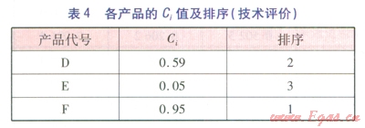 若不考慮經(jīng)濟(jì)性的影響,單從技術(shù)方面對(duì)產(chǎn)品進(jìn)行評(píng)價(jià),按同樣方法進(jìn)行計(jì)算,得到各產(chǎn)品的Ci值及排序見(jiàn)表4??梢?jiàn),技術(shù)排序與綜合評(píng)價(jià)排序相同,但是,各產(chǎn)品的技術(shù)優(yōu)劣勢(shì)很明確,F產(chǎn)品在技術(shù)上明顯優(yōu)于D產(chǎn)品。