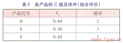 根據(jù)計(jì)算得到的Ci值大小進(jìn)行排序,Ci值越大,越接近于l,說(shuō)明越接近于最優(yōu)方案,產(chǎn)品綜合評(píng)價(jià)越優(yōu)。經(jīng)計(jì)算得到各產(chǎn)品的Ci值,其排序見(jiàn)表3。