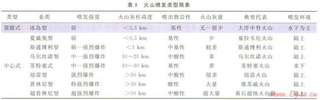 火山灰的形成數(shù)量和分布范圍主要受火山噴發(fā)類型和規(guī)模控制。火山噴發(fā)按巖漿的通道分為2大類:①裂隙式噴發(fā),又稱冰島型火山噴發(fā),巖漿沿地殼中的斷裂帶溢出地表,通常溫和寧靜,噴出物多為基性熔漿,碎屑和氣體較少;②中心式噴發(fā),巖漿通過管狀通道噴出地表,通常產生爆炸,噴出物多為中酸性熔漿,碎屑和氣體豐富。根據噴出物性質和噴發(fā)強烈程度,火山噴發(fā)可分為多種類型(表1),其中普林尼型等強烈爆炸式火山噴發(fā)形成的火山灰量最大。