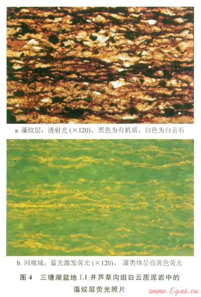 筆者等在陜西省銅川市金鎖關鎮(zhèn)霸王莊和何家坊上三疊統(tǒng)長7段剖面.:發(fā)現(xiàn)褐黑色油頁巖與灰白色碳酸鹽巖互層,可見多套薄層斑脫土;三塘湖盆地蘆草溝組云質泥巖的薄片鑒定和熒光照片也發(fā)現(xiàn)藻類與碳酸鹽巖紋層狀互層(圖4)。