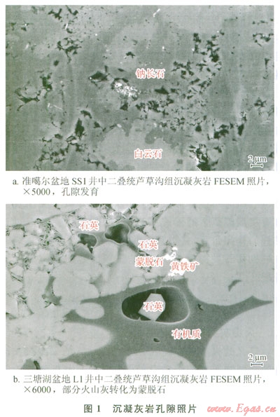 火山灰交代蝕變等成巖作用,不僅能形成大量的次生孔隙(圖1),改善頁巖油氣層的物性,而且火山灰形成的凝灰?guī)r、沉凝灰?guī)r、凝灰質泥巖等巖層還能成為頁巖油氣的有效儲層。另外,火山灰含有大量鈾、釷等放射性元素,可加速有機質的熱解,對頁巖油氣的生成具有積極意義[15-16]。
