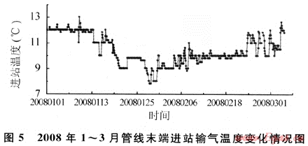 為保證該管線冬季不發(fā)生水合物堵塞,從2007年11月27日開(kāi)始,作業(yè)區(qū)采用緩蝕劑加注泵間歇式加注乙二醇,每間隔2h加注1次,每次加注30min,每天加注50kg左右;該生產(chǎn)期間,平均氣溫為9.37℃,管線末端輸氣溫度在10~12℃。從2008年1月4日開(kāi)始進(jìn)行動(dòng)力學(xué)抑制劑GHI-1現(xiàn)場(chǎng)試驗(yàn),采用連續(xù)式加注,白天(8:00~20:00)泵排量為21%,晚上(20:00~8:00)泵排量為25%,每天藥劑加量控制在13~16kg。此期間平均氣溫降至0~5℃,最低氣溫達(dá)-3℃,管線末端輸氣溫度在8~10℃。生產(chǎn)和試驗(yàn)期間,藥劑加注量如圖3所示,管線輸氣量、首末兩端壓差、輸氣溫度等生產(chǎn)運(yùn)行情況見(jiàn)表2和圖4、5所示。