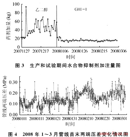 由于該天然氣水合物形成溫度較高(7.0MPa輸壓條件下的水合物形成溫度為18.60℃),投產(chǎn)初期井站節(jié)流閥、分離器等地面設(shè)備、生產(chǎn)管線及下游井站閥門(mén)、分離器、匯管和埋地管線經(jīng)常發(fā)生水合物堵塞現(xiàn)象,特別是在氣溫較低的冬季。每次冰堵后只能采取熱水淋、放空泄壓、清管通球等措施解堵,每3~5d必須清管通球1次,每次清管發(fā)現(xiàn)管內(nèi)有大量固體水合物。為保證該生產(chǎn)管線正常生產(chǎn),從2005年12月21日開(kāi)始,冬季生產(chǎn)過(guò)程中采取加注乙二醇防凍劑,每天間歇式加注45~60kg。