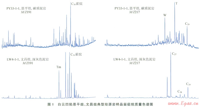 烴源巖樣品有機(jī)地球化學(xué)分析表明(表1、圖l),恩平組淺湖相、沼澤相烴源巖殘余有機(jī)碳含量(TOC)變化大(1.12%~56.18%),生烴潛力指數(shù)(Pg)較高(0.56~97.47mg/g);氫指數(shù)(HI)較低,介于50~300mg/g,有機(jī)質(zhì)類型為偏腐殖型干酪根;Pr/Ph為1.6~5.9,沉積環(huán)境變化大;C29規(guī)則甾烷優(yōu)勢,貧4-甲基甾烷系列;富含陸源三萜類生物標(biāo)志物,如W、T樹脂化合物含量高,奧利烷含量較低—中等。文昌組湖相烴源巖殘余有機(jī)碳含量適中(1.00%~2.50%),生烴潛力指數(shù)較高(8.18~l3.64mg/g);氫指數(shù)較高,介于446~566mg/g,有機(jī)質(zhì)類型為偏腐泥型干酪根;Pr/Ph為1.4~1.7,沉積環(huán)境為還原環(huán)境;與盆地北部珠一地區(qū)富生烴凹陷文昌組烴源巖特征不一樣,白云凹陷文昌組來源于藻類的C27規(guī)則甾烷含量較高,而貧4-甲基甾烷系列,推測當(dāng)時(shí)可能因處于不同的湖泊環(huán)境,其水生生物的種類也不同而導(dǎo)致;貧陸源三萜類生物標(biāo)志物,如W、T樹脂化合物和奧利烷含量低(或難于檢測)。烴源巖有機(jī)質(zhì)及生態(tài)組分中富含無定型和浮游藻類。
