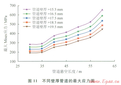 3)以上工況,把管道壁厚分別改變?yōu)?span lang="EN-US">15.5mm、16.5mm、18.5mm、19.5mm,計(jì)算管道最大Mises應(yīng)力的變化情況(圖11),最大Mises應(yīng)力隨壁厚的增加而下降,安全裕度隨壁厚增加而升高。為此,管道壁厚的增加量不能太大,若壁厚過大,為保持管道質(zhì)量不變,必須減少管徑,這會影響管道輸量;若要保持管道內(nèi)徑不變,壁厚增加太多,勢必使單位管段的耗材和質(zhì)量劇增,以至管道豎向受力增大。本文僅對管道壁厚作適度調(diào)整以觀察受力與管材結(jié)構(gòu)變化的關(guān)聯(lián)性,為碳纖維強(qiáng)固提供理論依據(jù)。碳纖維質(zhì)量小于鋼管,自身抗拉能力強(qiáng),對擘厚影響較小,這些特點(diǎn)可滿足上述分析的需要:即重量變動(dòng)不大、適當(dāng)改變材料組成及結(jié)構(gòu)、提高抗彎能力。