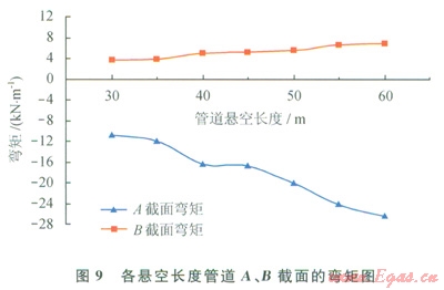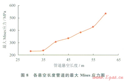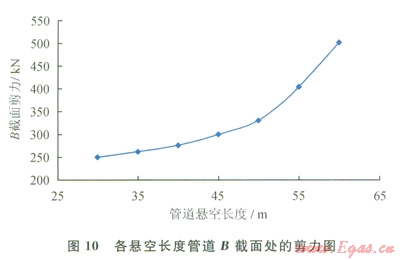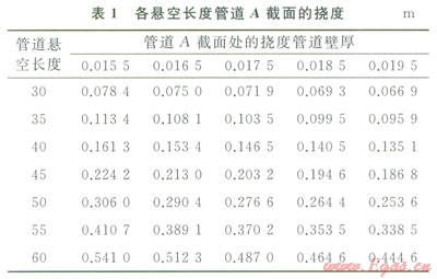 2)保持其他工況參數(shù)不變,改變懸空長度分別為35m、40m、45m、50m、55m、60m時(shí),汁算管道最大應(yīng)力、彎矩和撓度(見圖8~10和表l)??梢姡航孛?span lang="EN-US">A處撓度最大,截面B處剪力最大,管道易在截面B處發(fā)生剪力破壞。當(dāng)懸空長度為55m時(shí),管道已接近失效上限,仍處于安全范圍。60m時(shí),管道最大應(yīng)力大于485MPa,此時(shí)管道失穩(wěn),超出安全極限,理論上已失效。