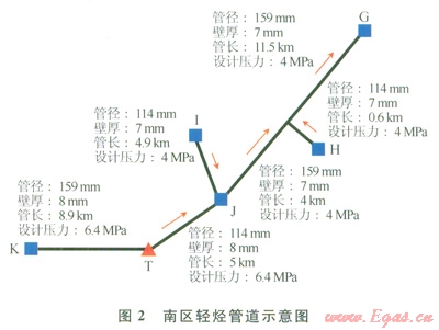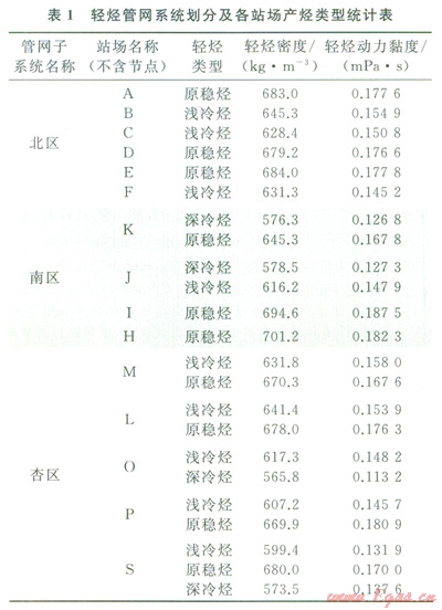 某油氣田輕烴管網(wǎng)系統(tǒng)為枝狀的網(wǎng)絡(luò)結(jié)構(gòu),總長(zhǎng)度為410.9km,包含12條輸烴管道、l6個(gè)油氣處理站、輸烴管道38條(管徑為76~219mm)。經(jīng)過(guò)多年的擴(kuò)建改造,該輕烴管網(wǎng)系統(tǒng)的管道、產(chǎn)烴站場(chǎng)逐漸增多,廢棄、在用、在建管道交錯(cuò)。為便于研究,根據(jù)管道之間的地域因素和水力相關(guān)性,將其劃分為3個(gè)互相獨(dú)立的子系統(tǒng),分別進(jìn)行研究。