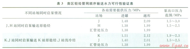 根據(jù)上述提出的南區(qū)輕烴管網(wǎng)順序輸送方案,分表2南區(qū)輕烴管網(wǎng)順序輸送外輸泵運(yùn)行方案表別對(duì)烴類進(jìn)入輕烴總庫(kù)罐區(qū)和實(shí)現(xiàn)越庫(kù)2種方式進(jìn)行水力可行性驗(yàn)證(表3)。由表3可知,各管道并未超壓,且外輸泵能夠提供輕烴順序輸送所需要的能量,因此該方案具有水力可行性。