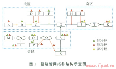 從地域分布來(lái)看,該輕烴管網(wǎng)系統(tǒng)可劃分為杏區(qū)與北部區(qū)塊,兩者之間沒(méi)有管道相連,各自形成獨(dú)立的水力系統(tǒng)。其中,北部區(qū)塊為網(wǎng)狀結(jié)構(gòu),因A站場(chǎng)與K站場(chǎng)之間管道已停止使用,因此,將北部區(qū)塊細(xì)分為北區(qū)和南區(qū)。輕烴管網(wǎng)系統(tǒng)的拓?fù)涫疽鈭D、子系統(tǒng)劃分情況見(jiàn)圖1、表l。圖l中綠色表示淺冷烴,紅色表示原穩(wěn)烴,黃色表示深冷烴,黑色箭頭線表示混輸管道,其余有色箭頭線則為僅輸送對(duì)應(yīng)顏色單種輕烴的管道。橢圓節(jié)點(diǎn)(N、Q、T)僅僅作為輕烴輸送中途轉(zhuǎn)接節(jié)點(diǎn)之用,并不生產(chǎn)輕烴。A、B、C、D、E、F、G、H、I、J、K、I。、M、O、P、R、S分別代表不同的產(chǎn)烴站場(chǎng)。