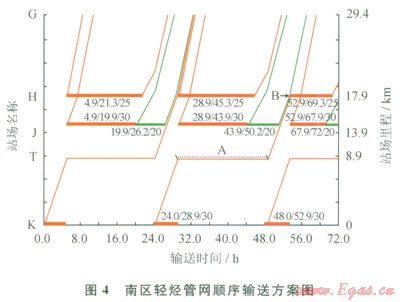 綜合考慮各站場(chǎng)產(chǎn)烴類型、產(chǎn)烴量、泵機(jī)組外輸量、啟泵時(shí)間需求、管道承壓能力、輸烴順序、混烴界面等[11],計(jì)算得出適用于南區(qū)輕烴管網(wǎng)的順序輸送方案(圖4)[12]。圖4的橫軸表示輸送時(shí)間,縱軸表示各站場(chǎng)距離首站的距離,圖中的有色矩形表示輕烴注入的時(shí)間窗(矩形長(zhǎng)方向的起點(diǎn)為開始注入時(shí)間,終點(diǎn)為結(jié)束注入時(shí)間),時(shí)間窗的顏色表示注入輕烴的類型,綠色代表淺冷烴,紅色代表原穩(wěn)烴。另外,時(shí)間窗的高度和流量大小成正比。時(shí)間窗周圍顯示該批次的注入工況,如“4.9/21.3/25”表示該時(shí)間窗注入開始于4.9h,結(jié)束于21.3h,流量為25m2/h。T節(jié)點(diǎn)輕烴的存儲(chǔ)時(shí)間依據(jù)各站場(chǎng)注烴時(shí)間而定,如,K站場(chǎng)注入的原穩(wěn)烴在T節(jié)點(diǎn)暫儲(chǔ)(見(jiàn)圖4中A虛線處),以使K站原穩(wěn)烴、J站淺冷烴、H站原穩(wěn)烴產(chǎn)生的混烴量最少(見(jiàn)圖4中B點(diǎn))。