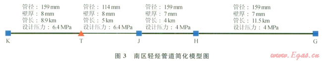 以南區(qū)為例說(shuō)明該輕烴管網(wǎng)系統(tǒng)順序輸送調(diào)度計(jì)劃的制訂過(guò)程。依據(jù)南壓輕烴注入的實(shí)際情況(圖1),考慮將K、J站場(chǎng)所產(chǎn)深冷烴通過(guò)單獨(dú)管道進(jìn)行外輸,而K、I、H站場(chǎng)所產(chǎn)原穩(wěn)烴和J站場(chǎng)所產(chǎn)淺冷烴進(jìn)行順序輸送。南區(qū)節(jié)點(diǎn)T并不產(chǎn)烴,僅利用其較大的儲(chǔ)罐容量作調(diào)節(jié)之用。根據(jù)現(xiàn)場(chǎng)提供的南區(qū)輕烴管道里程、高程、管徑、壁厚、管長(zhǎng)等基礎(chǔ)參數(shù)(圖2),為便于研究,將南區(qū)管道模型簡(jiǎn)化為單源多注入的管道系統(tǒng)(圖3)。