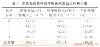 結(jié)合現(xiàn)場(chǎng)數(shù)據(jù),從泵站運(yùn)行費(fèi)用和混烴量?jī)煞矫鎭?lái)驗(yàn)證南區(qū)輕烴管網(wǎng)順序輸送方案的經(jīng)濟(jì)性(表4)[13]。表4表明,南區(qū)輕烴管網(wǎng)實(shí)現(xiàn)順序輸送后,可節(jié)省泵站運(yùn)行費(fèi)用76678元/a。