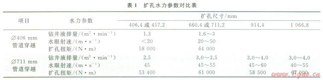 Æ406mm管道穿越擴(kuò)孔施工時發(fā)現(xiàn)鉆井液排量低于2m2/min、水眼射速低于50m/s時擴(kuò)孔扭矩大,鉆具磨損快。Æ711mm管道穿越擴(kuò)孔施工時調(diào)整了施工參數(shù),改進(jìn)了擴(kuò)孔器選型,使得擴(kuò)孔扭矩得到了有效控制,鉆屑及時排除,水力切削充分,鉆具幾乎沒有磨損,加快了施工進(jìn)度,保證了每次擴(kuò)孔一次性成功。根據(jù)3次管道穿越對鉆進(jìn)參數(shù)的調(diào)整情況,并結(jié)合現(xiàn)場實際可以達(dá)到的施工條件,最優(yōu)的鉆進(jìn)參數(shù)統(tǒng)計結(jié)果見表2。