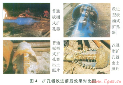2)采用改進(jìn)型板桶式擴(kuò)孔器,提高了擴(kuò)孔效率,降低了施工風(fēng)險(圖4)。采用新擴(kuò)孔器后,在Æ711mm-B管道穿越四級擴(kuò)孔施工中均是一次性完成了擴(kuò)孔,出土后的擴(kuò)孔器磨損很小,擴(kuò)孔效果極好。根據(jù)B管的擴(kuò)孔經(jīng)驗,在改進(jìn)擴(kuò)孔器切割方式的前提下,Æ711mm-A線進(jìn)一步優(yōu)化了擴(kuò)孔器水嘴的配置,使得鉆井液有效輔助切削,減小了擴(kuò)孔扭矩,將原來的四級擴(kuò)孔減少到三級(660.4mm、914.4mm、l066.8mm),提高了施工效率,節(jié)約了工期。