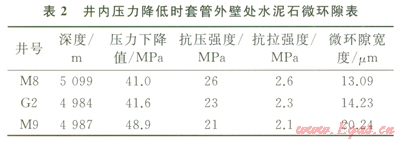 川中地區(qū)高壓天然氣井因Æl77.8mm尾管固井后,采用較低密度鉆井液替換井內(nèi)鉆井液鉆開目的層而使作用在井內(nèi)套管的內(nèi)壓力大幅度降低。該區(qū)塊Æ177.8mm尾管固井時(shí)鉆井液密度約為2.20g/cm3,而下一次開鉆鉆進(jìn)時(shí),鉆井液密度降至1.35g/cm3左右。M8、G2、M9井Æl77.8mm尾管固井,氣層封固質(zhì)量?jī)?yōu)良,候凝過(guò)程未發(fā)生氣竄,但井內(nèi)壓力大幅度下降后,喇叭口竄氣。該區(qū)塊水泥石楊氏模量10GPa,泊松比0.19,其余計(jì)算條件及結(jié)果如表2所示。以套管壁處水泥環(huán)徑向拉應(yīng)力達(dá)到抗拉強(qiáng)度為形成微環(huán)隙的臨界條件[7-8],由公式(3),計(jì)算出井內(nèi)壓力下降幅度超過(guò)40MPa后,3口井形成寬度l3.09~20.24mm的微環(huán)隙,密封能力顯著降低。