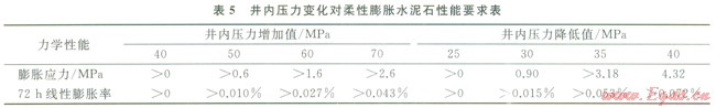 井下作業(yè)公司柔性自應(yīng)力水泥石能在高圍壓條件下膨脹,產(chǎn)生0.5~3.0MPa膨脹壓應(yīng)力,楊氏模量在5~7GPa,泊松比約為0.19,抗拉強(qiáng)度在2.5~3.5MPa。當(dāng)固井后井內(nèi)壓力增加時(shí),通過(guò)釋放壓縮應(yīng)力,減小水泥環(huán)周向拉應(yīng)力,避免拉伸破壞,同時(shí)外觀體積微膨脹,可阻止微環(huán)隙形成。由公式(1)、(2)計(jì)算出表5所示不同井內(nèi)壓力變化情況下柔性膨脹水泥石體積膨脹要求。該水泥漿體系在相國(guó)寺儲(chǔ)氣庫(kù)井技術(shù)套管、頁(yè)巖氣井的油層套管固井中得到了成功應(yīng)用,固井質(zhì)量?jī)?yōu)質(zhì),在經(jīng)過(guò)試壓、大型體積壓裂作業(yè)后,環(huán)空封固質(zhì)量好,未發(fā)生氣竄。