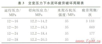 地下儲(chǔ)氣庫(kù)井天然氣注入和采出的作業(yè)使作用在井內(nèi)套管的內(nèi)壓力交替變化。這種交變壓力可能引起水泥石內(nèi)部固有的微裂紋緩慢擴(kuò)展、連通,導(dǎo)致水泥石疲勞破壞[9-11]。以井深2107m的儲(chǔ)氣庫(kù)井為例,水平地應(yīng)力30MPa,井徑215.9mm,套管直徑l77.8mm,壁厚11.51mm,運(yùn)行壓力12~28MPa,水泥石楊氏模量l0GPa,泊松比0.19,根據(jù)水泥石疲勞破壞方程[12]計(jì)算出交變壓力作用下普通水泥石疲勞破壞周期如表3所示。儲(chǔ)氣庫(kù)井注采氣過(guò)程中運(yùn)行壓力越高,普通水泥環(huán)越易疲勞破壞。當(dāng)達(dá)到最大運(yùn)行壓力時(shí),只需數(shù)十次注采周期,水泥環(huán)即發(fā)生疲勞破壞。
