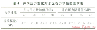 彈性水泥石具備了低楊氏模量、彈性變形能力強(qiáng)的特點(diǎn),能與套管、井壁協(xié)調(diào)變形,有效卸載,大幅度降低微裂隙及微環(huán)隙形成的可能性。由公式(1)、(2)計(jì)算出當(dāng)井內(nèi)壓力變化時(shí),為避免水泥環(huán)破壞,需將水泥石楊氏模量降至適當(dāng)范圍(表4)。以斯倫貝謝為代表的典型彈性水泥石,楊氏模量在3.5~5.5GPa,泊松比約為0.22,抗拉強(qiáng)度在2.2~2.5MPa,在儲(chǔ)氣庫(kù)得到成功應(yīng)用,固井質(zhì)量?jī)?yōu)質(zhì),在經(jīng)過(guò)試壓及下一次開鉆鉆進(jìn)井內(nèi)壓力變化后,固井質(zhì)量依然良好,未出現(xiàn)氣竄。