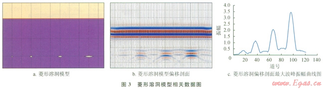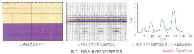 圖2-b是橢圓形溶洞偏移剖面,圖2-c為橢圓形溶洞最大波峰振幅曲線圖;圖3-b、圖3-c分別是菱形溶洞偏移剖面及最大波峰振幅曲線圖。可以看到,無論是橢圓形模型還是菱形模型,隨著溶洞橫向尺度的增加最大波峰振幅是增加的,這和長(zhǎng)方形溶洞正演模擬結(jié)果很相似。