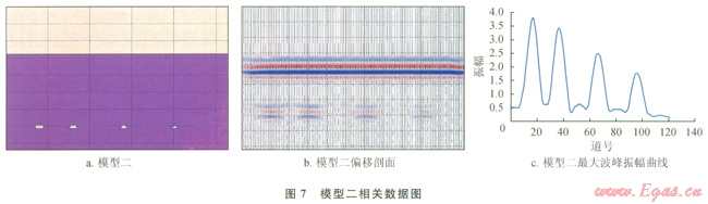 圖6、7分別是模型一和模型二的相關(guān)數(shù)據(jù),由圖6-c可知,模型一中溶洞對(duì)應(yīng)振幅的關(guān)系為:長(zhǎng)方形溶洞>不規(guī)則溶洞>半圓形溶洞,這與溶洞面積關(guān)系是一致的,且模型一中第l個(gè)溶洞和第3個(gè)溶洞形態(tài)大小差距很小,但在最大波峰振幅曲線上依然可以將兩者區(qū)分開,由圖7-c可知模型二也有相似的結(jié)論,故而在菲涅爾帶內(nèi)溶洞形態(tài)對(duì)于振幅是敏感的。