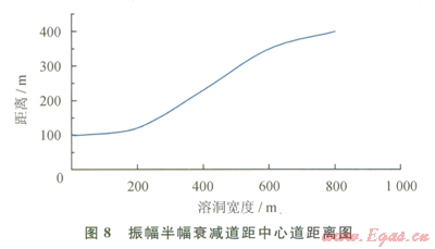 圖8為不同寬度溶洞反射的振幅衰減至最大振幅一半時(shí)對(duì)應(yīng)地震道距溶洞中心道的距離圖,這一屬性可以反映溶洞在剖面上的響應(yīng)寬度隨溶洞寬度的變化情況。從圖中可以看到,隨著溶洞寬度的增加,半幅衰減道與中心道距離是不斷增加的,增大幅度是先變大再變小,在菲涅爾帶半徑附近增大幅度達(dá)到最大。