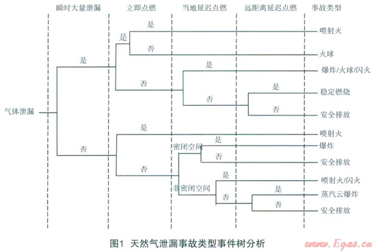 通過對近200例國內(nèi)外燃氣管道泄漏、火災(zāi)爆炸事故案例的統(tǒng)計分析,由于第三方破壞、腐蝕等原因會發(fā)生泄漏、穿孔、破裂等失效模式后,當遇到點火源時通常會發(fā)生噴射火、火球、閃火、蒸氣云爆炸等危害模式。燃氣泄漏事故類型事件樹分析見圖l。當管道遭到破壞發(fā)生瞬時大量泄漏時,如果立即被點燃,在燃氣與空氣混合均勻的情況下會發(fā)生噴射火事故;燃氣與空氣混合不均勻時則會發(fā)生火球事故;如果大量泄漏的燃氣未被立即點燃,而是在當?shù)財U散形成氣云后被點燃,則會發(fā)生爆炸、火球或閃火等事故。當泄漏天然氣擴散至密閉空間或受限空間后,遇到點火源則會發(fā)生爆炸事故,這種發(fā)生在限制空間內(nèi)的爆炸破壞性較強,往往導致建筑物倒塌,從而可能產(chǎn)生較大的人員傷亡。天然氣泄漏形成可燃氣云爆炸、燃燒產(chǎn)生的爆炸沖擊波以及大量熱輻射形成的熱傷害會對人員生命財產(chǎn)安全產(chǎn)生重大威脅,其形成爆炸火球或爆炸沖擊波影響范圍和程度由天然氣泄漏速率、暴露時間、環(huán)境條件以及點火能量等參數(shù)所決定。