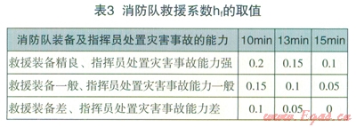 消防隊對燃氣事故的降災(zāi)作用,表現(xiàn)為消防隊的反應(yīng)時間和消防隊的裝備及指揮人員的對災(zāi)害事故的處置能力兩個方面。結(jié)合我國消防隊到達現(xiàn)場所用的一般時間標準以及消防救援裝備和指揮能力評判,消防隊救援系數(shù)hf的取值見表3。