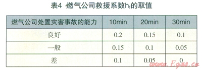 通過對所統(tǒng)計的城市中高壓燃氣管道事故中燃氣公司處置情況進行分析可知,燃氣公司對燃氣事故的降災(zāi)作用,表現(xiàn)為燃氣公司的反應(yīng)時間和燃氣公司對災(zāi)害事故的處置能力兩個方面。表示燃氣公司救援系數(shù)的取值見表4。