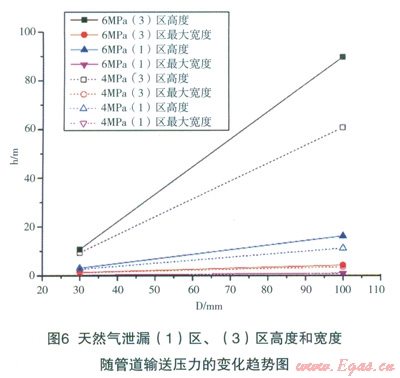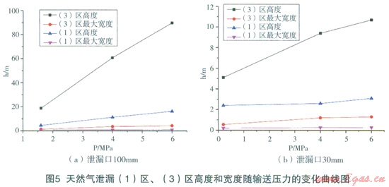 DN900在運行壓力6.0MPa,輸氣能力為74.3萬m3/h的高壓天然氣輸送管道(管壁厚度l0mm),埋地深度1.2m,泄漏點孔徑30mm時,天然氣泄漏口速度較大,屬超聲速天然氣氣流在空氣中的射流擴散,因此,在高度方向的擴散遠大于在水平方面的擴散。如圖4所示,在泄漏5s時,天然氣高度已達150m;25s天然氣已擴散至大于250m的高空;50s其在250m下的空間擴散形狀趨于定常,即形狀隨時間推移基本一致。圖5給出了泄漏口l00mm、30mm條件下天然氣泄漏(1)區(qū)、(3)高度和寬度隨輸送壓力的變化曲線圖。從模擬計算結(jié)果可以看出,隨著輸送壓力的增大,在相同泄漏口條件下,泄漏天然氣流量增大,導致(1)區(qū)、(3)高度和寬度增大。圖6給出了天然氣泄漏(1)區(qū)、(3)高度和寬度隨泄漏口直徑的變化趨勢圖,圖中表明:在相同輸送壓力下,泄漏口直徑增大,相當于泄漏天然氣流量增大,導致(1)區(qū)、(3)高度和寬度增大。