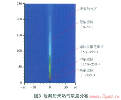 天然氣中高壓輸送管道泄漏后,無風條件下,在大氣中以射流的方式存在(如圖3所示)。根據(jù)其爆炸性,可以分為4個區(qū)域:(1)高天然氣濃度區(qū):當空氣中天然氣濃度達25%~30%時,可引起頭痛、頭暈、乏力、注意力不集中、呼吸和心跳加速、共濟失調(diào)。若不及時脫離,可致窒息死亡。當濃度大于30%,在較短的時間內(nèi)就會窒息死亡;(2)中濃度區(qū)(15%~25%);(3)爆炸極限范圍區(qū)(5%~15%):在該濃度范圍內(nèi),遇熱源、明火或其它點火源有燃燒爆炸危險;(4)低天然氣濃度區(qū):