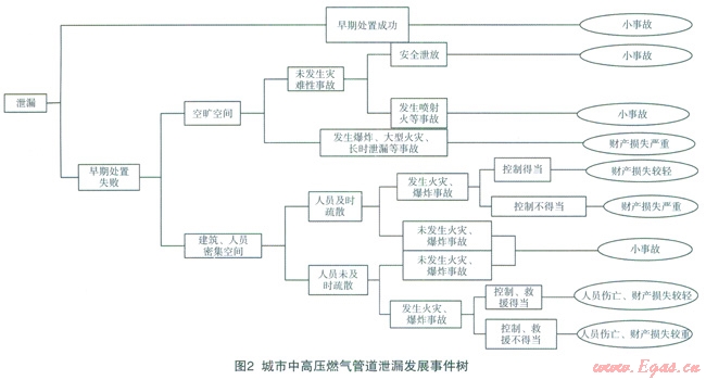 本文搜集了近年來百余例城市中高壓燃氣管道泄漏事故,利用事件樹的方法分析了城市中高壓燃氣管道發(fā)生泄漏后事故發(fā)展場景,利用故障樹分析方法對城市中高壓燃氣管道災(zāi)害性事故原因,以及城市燃氣管道事故的降災(zāi)因素進行了分析,提出了城市中高壓燃氣管道風險分析中降災(zāi)因子模型。