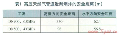 考慮到風速以及環(huán)境條件對天然氣泄漏擴散的影響,高度方向保守安全系數(shù)為2,水平方向保守安全系數(shù)取為4,則高壓天然氣管道泄漏爆炸的最小安全距離如表l所示。而在天然氣泄漏點源的常年風向下風向位置,水平方向的安全距離則應(yīng)適當增大。