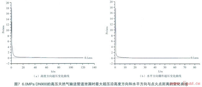 泄漏天然氣發(fā)生燃燒爆炸時,爆炸氣云將形成巨大破壞作用的爆炸超壓,當超壓0.1atm時,就可造成橋梁、救生艇等破壞;當超壓0.35atm時,可以將戶外人員吹走或埋入廢墟,具有50%的致命率,可嚴重破壞建筑物或工廠。通常以超壓0.1atm作為危險的臨界條件。圖7給出了DN900運行壓力6.0MPa,輸氣能力為74.3萬m3/h的高壓天然氣輸送管道泄漏點孔徑100mm,泄漏時間10min條件下,氣云爆炸最大超壓隨高度以及水平距離的變化曲線。圖中計算結(jié)果表明:在初始點火后,迅速形成爆轟,并達到約l8atm的超壓;隨著高度的增加,超壓先明顯衰減,隨后緩慢衰減,大約距地面66.5m高度超壓衰減至0.1atm。水平方向,在點火點附近,由于爆轟的存在,超壓高至約l8atm左右;隨著遠離點火點,超壓也是先明顯衰減,隨后緩慢衰減,在距離點火點l5.6m處,超壓降至0.1atm。