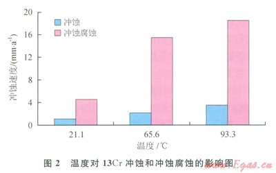天然氣(無論是否存在固體顆粒)在一定流動速度下將對生產(chǎn)管柱表面造成沖擊從而使油管發(fā)生磨損,高速流動的氣體還足以將油管內(nèi)壁表面黏附不牢的腐蝕產(chǎn)物沖走,或者破壞已形成的保護(hù)性氧化膜,從而加劇腐蝕,降低管柱強度,在往復(fù)的注采過程中將容易導(dǎo)致油管破裂。研究表明:當(dāng)氣體流速低于臨界沖蝕流速時,沖蝕不明顯;當(dāng)氣體流速高于臨界沖蝕流速時,會產(chǎn)生明顯的沖蝕,嚴(yán)重影響氣井的安全生產(chǎn)[9]。另外,隨著溫度的增加,流體對金屬的沖蝕作用和沖蝕腐蝕作用將增強(圖2),因此在設(shè)計時除考慮流速的影響外,還需要考慮溫度的因素。