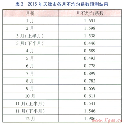 2015年天津市各類用戶天然氣用量預(yù)測(cè)結(jié)果見表2。由表2可知,2015年最大用氣量將達(dá)到164.02×108m3,并作為計(jì)算2015年季節(jié)調(diào)峰儲(chǔ)氣量的基礎(chǔ)數(shù)據(jù)。2015年天津市各月不均勻系數(shù)預(yù)測(cè)結(jié)果見表3,由于3月15日、ll月15日分別為供暖期結(jié)束和供暖期開始時(shí)間,因此這兩個(gè)月的上下半月不均勻系數(shù)變化較大。