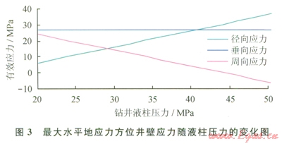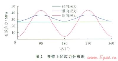 式中s′r、s′q、s′z,分別為井壁徑向、周向、垂向的有效應(yīng)力;pwf井內(nèi)液柱壓力;pp為地層壓力;m為巖石泊松比;m為井周角(井壁上某點(diǎn)的失徑與最大水平地應(yīng)力方位的夾角) sH、sh分別為最大、最小水平地應(yīng)力。