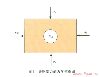 任何一口油氣井鉆開(kāi)前原地應(yīng)力就已存在于地層巖石中,油氣井眼鉆開(kāi)后,井內(nèi)流體壓力取代了被鉆巖層提供的支撐,無(wú)疑會(huì)引起井眼周圍巖石應(yīng)力的重新分布[21-22]。假設(shè)井眼周圍的地層為多孔彈性介質(zhì),其應(yīng)力分布可用以下力學(xué)模型求解:在無(wú)限大平面上,一圓孔受均勻的內(nèi)壓,而在這個(gè)平面的無(wú)限遠(yuǎn)處受兩個(gè)水平地應(yīng)力的作用,在垂直方向上受上覆巖層壓力作用,如圖l所示。由于井周地層應(yīng)力最大的點(diǎn)出現(xiàn)在井壁上[23],筆者僅給出了井壁上的應(yīng)力分布公式。直井井壁圍巖有效應(yīng)力為[23]: