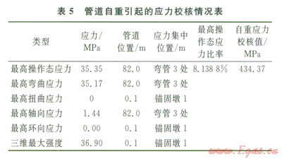 3)一次應(yīng)力占管道綜合應(yīng)力的97.12%,故占管道應(yīng)力的大部分。同時(shí),在管道自重對(duì)一次應(yīng)力影響的校核中,管道自重占一次應(yīng)力的8.9%,所占比例較小。因此,管道內(nèi)壓是產(chǎn)生一次應(yīng)力的主要因素。在一次應(yīng)力校核中發(fā)現(xiàn)應(yīng)力集中點(diǎn)在管道彎管3處,由于一次應(yīng)力反映的是管道內(nèi)壓和管道以及管內(nèi)介質(zhì)的自重對(duì)管道應(yīng)力的影響,因此,在試壓工況下,影響管道應(yīng)力的最主要因素是管道內(nèi)壓。