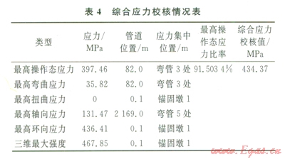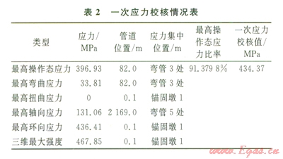 由表2~5可知,最高操作態(tài)綜合應(yīng)力產(chǎn)生在管道彎管3處,管道系統(tǒng)單元l70~180即管道76~82m處的最高操作態(tài)應(yīng)力為397.46MPa,最高操作態(tài)應(yīng)力比率為91.5034%,綜合應(yīng)力主要產(chǎn)生在彎管3處,一次、二次應(yīng)力及綜合應(yīng)力校核最高節(jié)點(diǎn)應(yīng)力均未超過(guò)434.37MPa,滿足管道的強(qiáng)度和柔性要求。