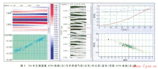 為了確定該氣田的AVO類型,首先從理論出發(fā)統(tǒng)計(jì)了井上的氣層及上覆地層的屬性參數(shù),包括縱橫波速度、密度、泊松比等參數(shù),并通過(guò)Shuey’S的簡(jiǎn)化Zoeppritz方程計(jì)算了反射系數(shù),發(fā)現(xiàn)氣層頂面的反射系數(shù)大,而泊松比變化較小[15],滿足產(chǎn)生第Ⅳ類異常的條件;接著選擇代表性的井(Y4井)進(jìn)行了正演模擬,模擬結(jié)果顯示該井正演道集的氣層頂面均對(duì)應(yīng)波谷(負(fù)反射系數(shù)),并且隨著偏移距的增加振幅逐漸減弱(圖3左);隨后對(duì)Y4井旁的實(shí)際地震道集進(jìn)行了AVO分析(網(wǎng)3右),從實(shí)際道集中提取的氣層頂面AVO曲線表明:在偏移距200~4500 m的變化范圍內(nèi),反射系數(shù)均為負(fù)值,并且其絕對(duì)值隨著偏移距的增大而減小,與正演模擬結(jié)果吻合,證實(shí)了該氣藏的IV類AVO特征。