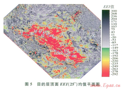圖5為從反演得到的EEI(25°)屬性沿目的層頂面開(kāi)l0ms時(shí)窗提取的算術(shù)平均值平面圖,圖中綠色到紅色對(duì)應(yīng)EEI值小于-l50,并且顏色從綠色到紅色對(duì)應(yīng)的EEI值逐漸降低。結(jié)合本區(qū)的鉆井情況和構(gòu)造形態(tài)可知,圖5中紅色異常范圍(即EEI值小于-150的范圍)與該層鉆井證實(shí)的含氣范圍吻合好。在EEI屬性平面圖上,鉆遇水層的E9井處EEI屬性表現(xiàn)為水層特征,而其他含氣性好的井則對(duì)應(yīng)相對(duì)低的EEI值,這說(shuō)明利用EEI屬性能有效地區(qū)分出氣層和水層。另外,A9井區(qū)物性較好的位置主要集中在構(gòu)造高部位,即A9井的周圍,但是分布的范圍較小,這可能就是A9井生產(chǎn)過(guò)程中壓力下降較快的一個(gè)原因。