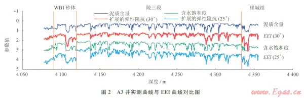 圖2為相應(yīng)角度的EEI曲線與實(shí)測(cè)的泥質(zhì)含量曲線(Vsh)、含水飽和度(Sw)曲線的比較圖,從圖2中可以看出,EEI(30°)與泥質(zhì)含量曲線具有很好的一致性,而EEI(25°)與含水飽和度曲線具有很高的相似度,氣田內(nèi)的其他井也具有類似的情況。