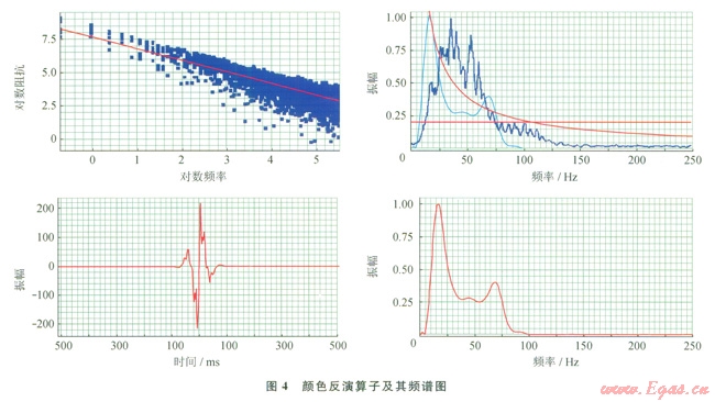 尋找合適的操作算子是顏色反演的關(guān)鍵,其具體方法是利用工區(qū)內(nèi)一組井的聲阻抗擬合一條“理想”的輸出阻抗譜,利用井旁一組地震道求取平均地震譜。從以上兩個(gè)頻譜可以求取操作算子的頻譜,使得地震譜形狀在地震頻帶內(nèi)轉(zhuǎn)換為阻抗譜。