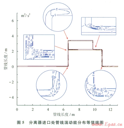 由于結構的變化,彎頭迎著來流方向的內弧面首先承受流體的沖刷,且流體速度達到最大,表明該位置的沖刷破壞危險性較高。與此同時,彎頭迎流側中上部位置形成局部湍流,湍流強度有明顯增強,湍流動能數(shù)在彎頭區(qū)域處達到最大值75m2/s2(圖5)。由于流體的慣性作用,流體沿著彎頭的弧度向前流動,正對著來流方向的彎頭外弧面上方的直管段位置,也承受了較大的沖刷作用;T形管內最大流速發(fā)生在來流支管主流區(qū)域和與主流管道垂直的支管道內遠離主流一側的區(qū)域,而與主流方向一樣的另一條支管道內的流速則相對平緩。同時,渦流程度也在垂直主管道的支管道中靠近主流的一側以及支管道與主管道銜接部位的拐角處有了較大提高,湍流動能數(shù)也達到了該管線的峰值。
