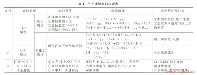 氣井大修過(guò)程中起m油管腐蝕檢測(cè)及分析結(jié)果表明,靖邊氣田氣井油管電化學(xué)腐蝕與應(yīng)力腐蝕同時(shí)存在,但主要發(fā)生由H2S—CO2—H2O(C1—)體系引起的電化學(xué)腐蝕[2],見(jiàn)表1。