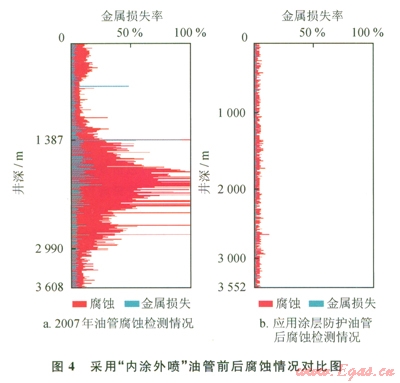 結(jié)果表明:應(yīng)用DPC內(nèi)涂層+外雙金屬?gòu)?fù)合噴涂技術(shù)油管后,檢測(cè)發(fā)現(xiàn)油管內(nèi)壁腐蝕輕微,最大腐蝕量控制在本體的l0%以內(nèi),腐蝕速率最大為0.11mm/a。通過(guò)前后兩種氣井管柱腐蝕狀況對(duì)比,發(fā)現(xiàn)該油管防腐效果良好。截至目前,該井油管使用時(shí)間已超過(guò)5年,生產(chǎn)正常。